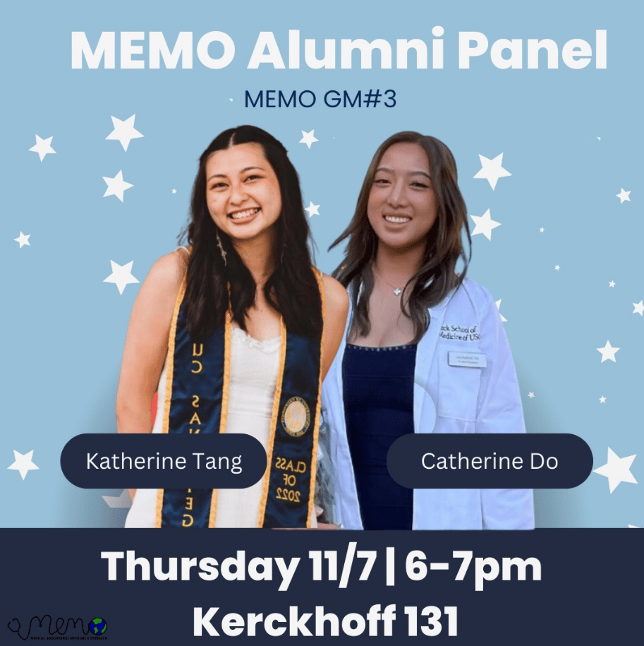Join us tomorrow for MEMOâs upcoming General Meeting and Alumni Pre-Health Panel! Gain valuable insights into the healthcare field, hear inspiring journeys from MEMOâs very own alumni (Catherine and Katherine), and learn how to prepare for a successful career in medicine and beyond. Donât miss this opportunity to connect, ask questions, and build your network! We hope to see y'all there!