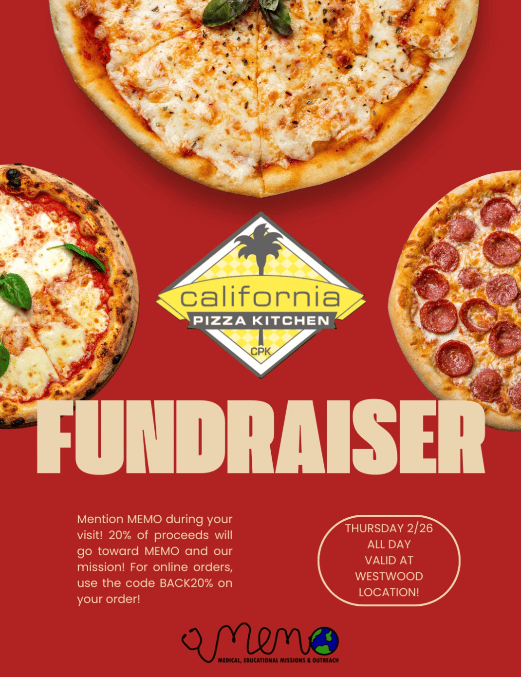 We’re raising dough… and it’s not just for the pizza! Feeling hungry after our general meeting this Thursday? Join us at California Pizza Kitchen all day on 02/26 for a slice and a good cause. Remember to mention MEMO when you dine in or use the code BACK20% for online orders. Life’s too short to skip pizza, especially when all proceeds will be donated to our medical and educational outreach missions! See you there!! WHEN: Thurs, Feb 26th, All Day! | ![]() |